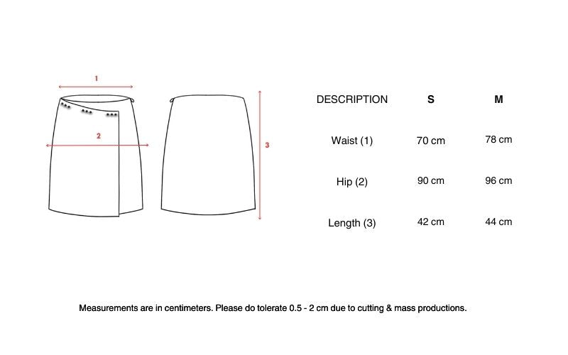 A-line asymmetrical skirt in pinstripes polyester blend, featuring small contrasting pearl buttons that allow the skirt to be styled in multiple ways by adjusting the button positions